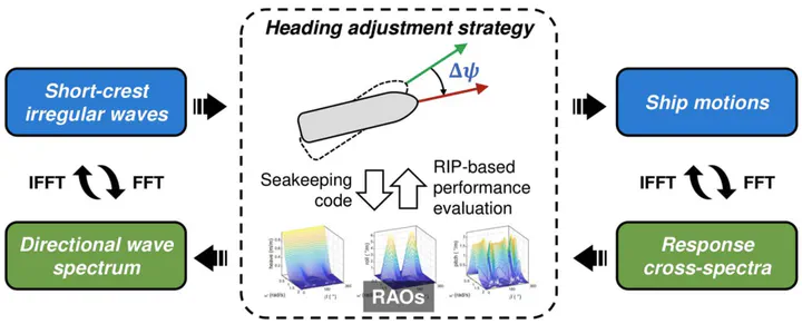 The strategy first identifies the peak wave frequency and mean direction of the current sea state. The algorithm then checks if the ship is in a predefined “inferior” sea state (e.g., head or following seas). If so, a heading adjustment is imperative. If not, the algorithm further checks if the RIP assessment value exceeds a preset threshold. If the value is too high (implying poor performance), a heading adjustment is also deemed necessary.